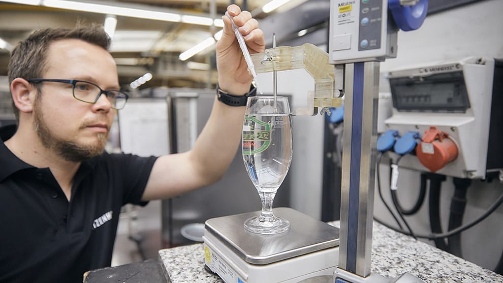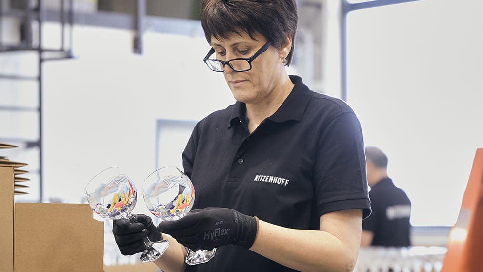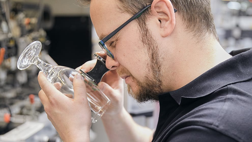 Wir beliefern mit unseren Gläsern „Made in Germany“ die Getränkeindustrie auf der ganzen Welt. Unser Qualitätsmanagement hat einen umfassenden Qualitätssicherungs-Prozess installiert. So stellen wir sicher, dass unsere nationalen und internationalen Kunden mit Gläsern in gleichbleibender Ritzenhoff-Qualität beliefert werden. Wir prüfen unsere Gläser von Anfang an und während des gesamten Produktions- und Veredelungsprozesses digital und manuell. So werden schon die ersten Rohlinge noch an der Maschine in einer manuellen Selektion sortiert. Nur die Kelche, die dem prüfenden Blick standhalten, erhalten im zweiten Arbeitsgang Stiel und Fuß. Die Chargen werden kontinuierlich und in Stichproben geprüft und mit vordefinierten Grenzwerten abgeglichen, die Daten gespeichert und die Produktion entsprechend feingesteuert. So lassen sich die natürlichen Qualitätsschwankungen des schwierigen Materials Glas kontrollieren und innerhalb vorgegebener Toleranzen halten.